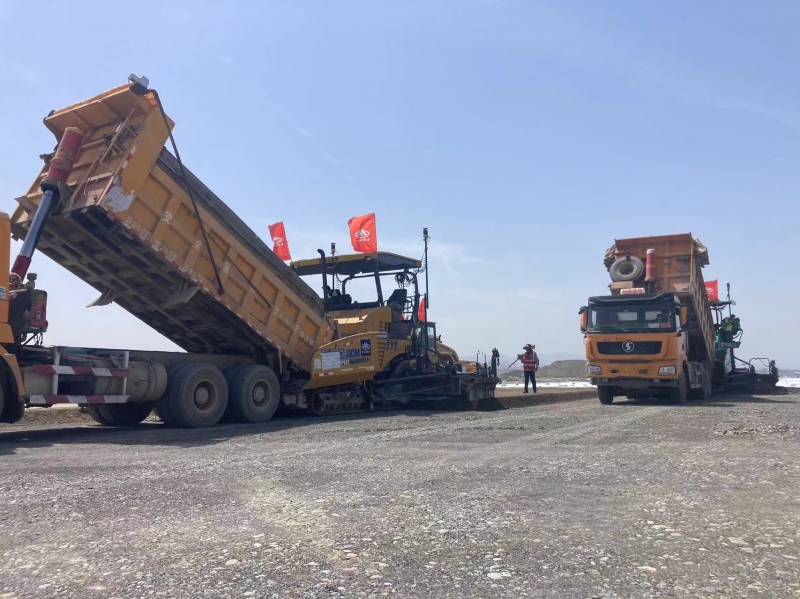 為保證攤鋪順利進行,項目部前期做好各項準(zhǔn)備工作,在施工過程中,嚴(yán)格把控施工環(huán)節(jié),確保攤鋪施工銜接有序,高效優(yōu)質(zhì),一次成型,并使用mmGPS 3D攤鋪技術(shù)進行兩機聯(lián)鋪。